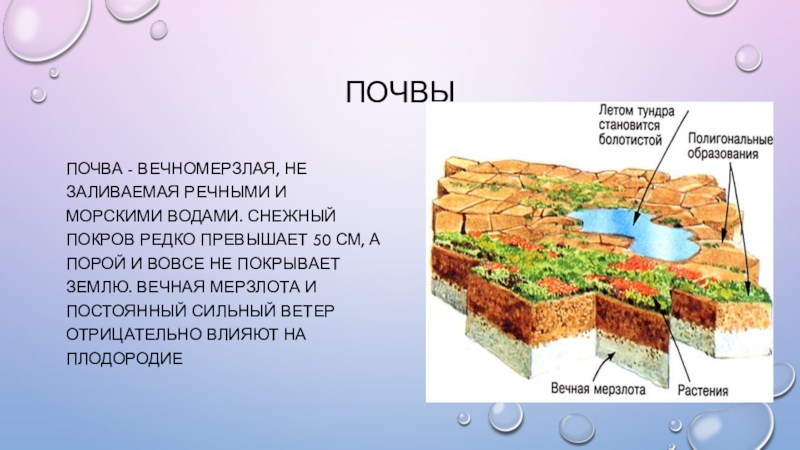 ПочвыПочва - вечномерзлая, не заливаемая речными и морскими водами. Снежный покров редко превышает 50 см, а порой
