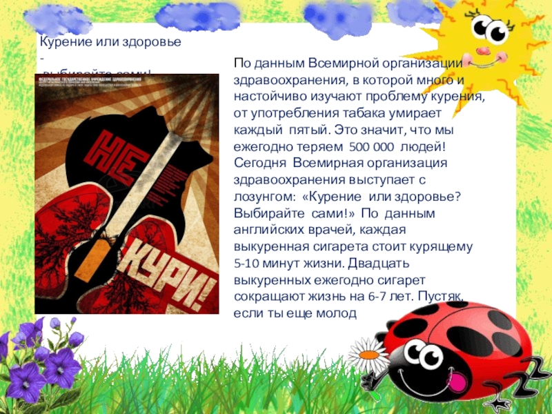 в которой много и настойчиво изучают проблему курения, от употребления табака умирает каждый пятый. Это значит, что мы ежегодно теряем 500 000 людей! Сегодня Всемирная организация здравоохранения выступает с лозунгом: «Курение или здоровье? Выбирайте сами!» По данным английских врачей, каждая выкуренная сигарета стоит курящему 5-10 минут жизни. Двадцать выкуренных ежегодно сигарет сокращают жизнь на 6-7 лет. Пустяк, если ты еще молод