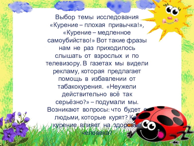 такие фразы нам не раз приходилось слышать от взрослых и по телевизору. В газетах мы видели рекламу, которая предлагает помощь в избавлении от табакокурения. «Неужели действительно всё так серьёзно?» – подумали мы. Возникают вопросы: что будет с людьми, которые курят? Как курение влияет на здоровье человека?