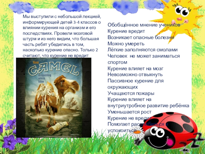 влиянии курения на организм и его последствиях. Провели мозговой штурм и из него видим, что большая часть ребят убедились в том, насколько курение опасно. Только 2 считают, что курение не вредит