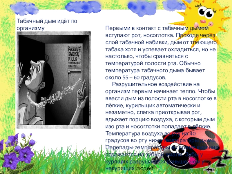 Разрушительное воздействие на организм первым начинает тепло. Чтобы ввести дым из полости рта в носоглотке в лёгкие, курильщик автоматически и незаметно, слегка приоткрывая рот, вдыхает порцию воздуха, с которым дым изо рта и носоглотки попадает в лёгкие. Температура воздуха во рту на 40 градусов во рту ниже температуры дыма. Перепады температуры во время курения отражается на зубной эмали. Зубы у курящих разрушаются раньше, чем у некурящих людей