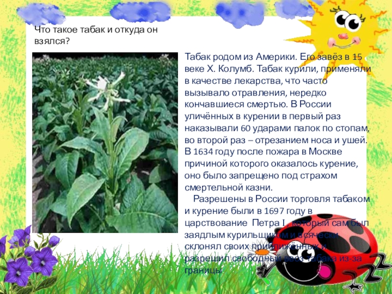завёз в 15 веке Х. Колумб. Табак курили, применяли в качестве лекарства, что часто вызывало отравления, нередко кончавшиеся смертью. В России уличённых в курении в первый раз наказывали 60 ударами палок по стопам, во второй раз – отрезанием носа и ушей. В 1634 году после пожара в Москве причиной которого оказалось курение, оно было запрещено под страхом смертельной казни.