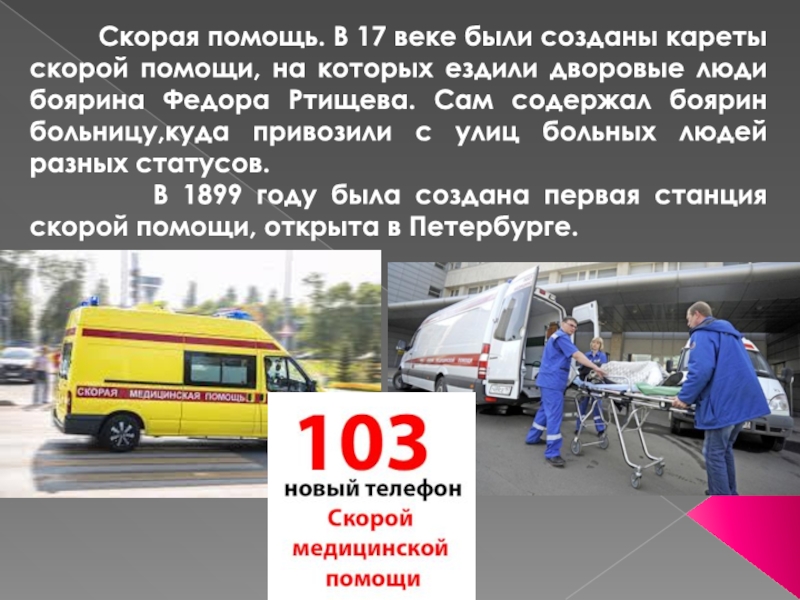 Скорая помощь. В 17 веке были созданы кареты скорой помощи, на которых