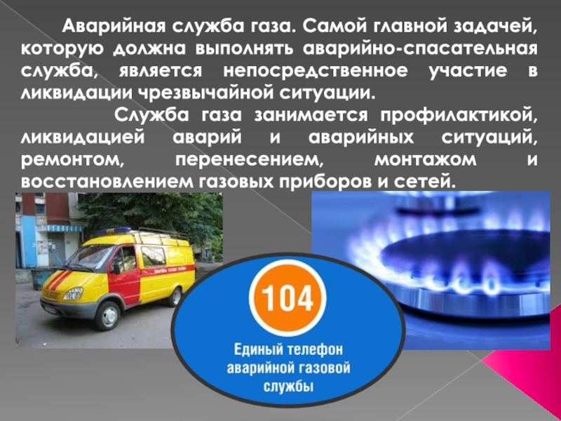 Слайд 6 Аварийная служба газа. Самой главной задачей, которую