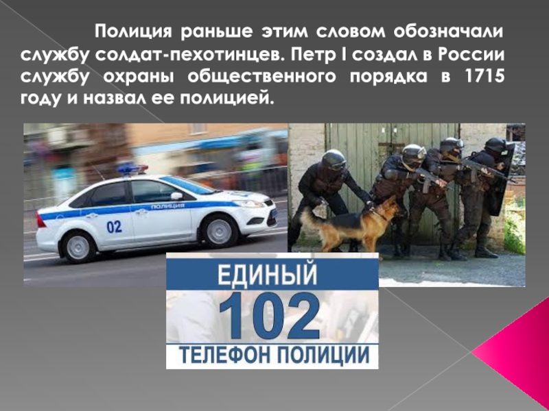 Полиция раньше этим словом обозначали службу солдат-пехотинцев. Петр I создал в России службу