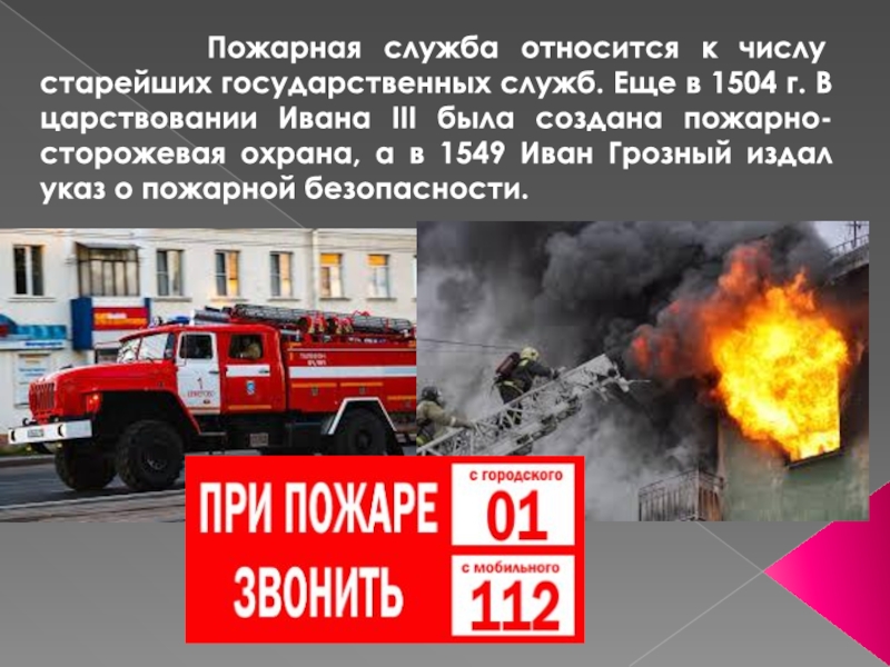 служб. Еще в 1504 г. В царствовании Ивана ІІІ была создана пожарно- сторожевая охрана, а в 1549 Иван Грозный издал указ о пожарной безопасности.
