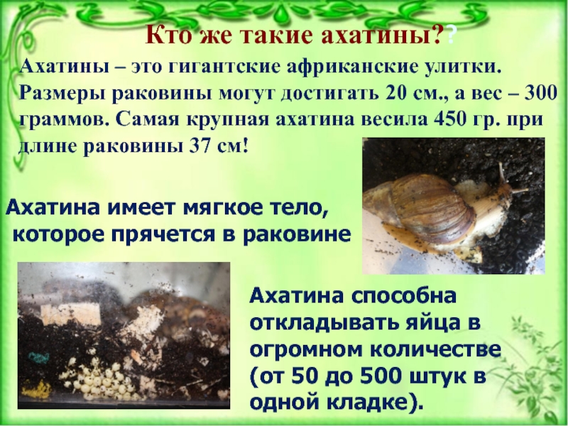 Ахатина способна откладывать яйца в огромном количестве (от 50 до 500 штук в одной кладке).