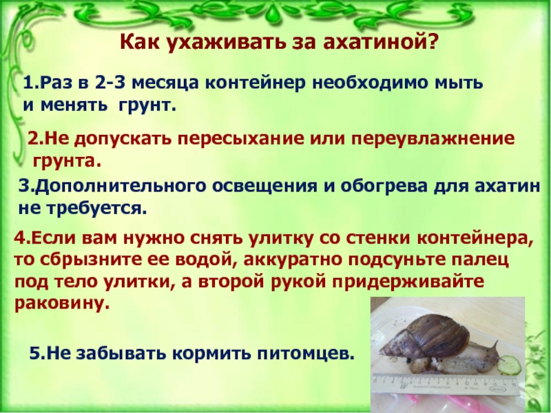 3.Дополнительного освещения и обогрева для ахатин не требуется.