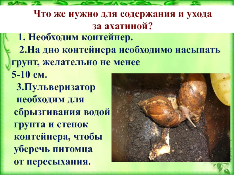 Ахатинам нужна вода. Однако ёмкость с водой лучше не ставить в контейнер. Лучше сбрызнуть стенки контейнера водой из пульверизатора.