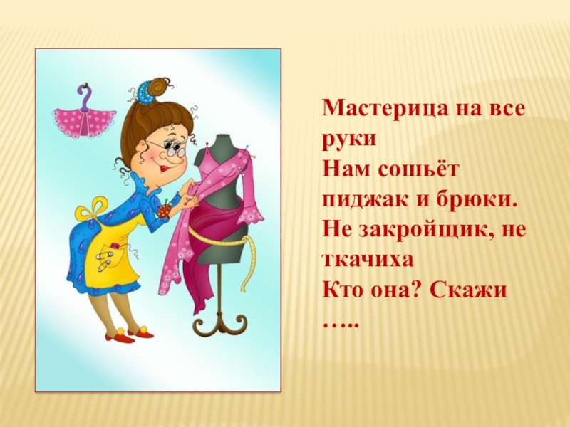 Мастерица на все рукиНам сошьёт пиджак и брюки.Не закройщик, не ткачихаКто она? Скажи …..