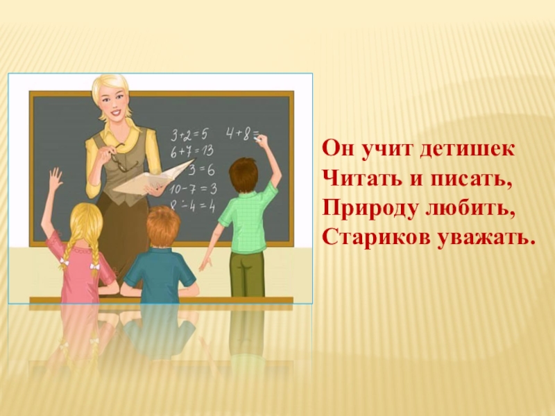 Он учит детишекЧитать и писать,Природу любить,Стариков уважать.