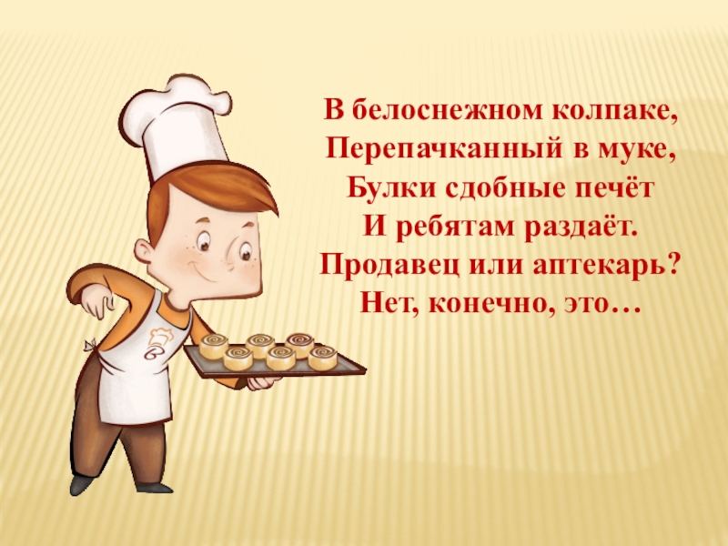 Слайд 4В белоснежном колпаке, Перепачканный в муке, Булки сдобные печёт И ребятам раздаёт. Продавец или аптекарь? Нет,