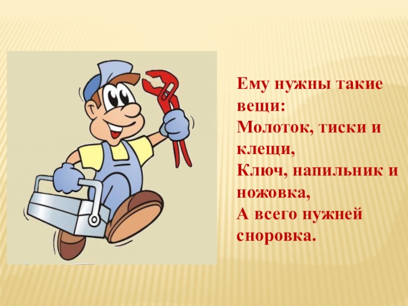 Ему нужны такие вещи:Молоток, тиски и клещи,Ключ, напильник и ножовка,А всего нужней сноровка.