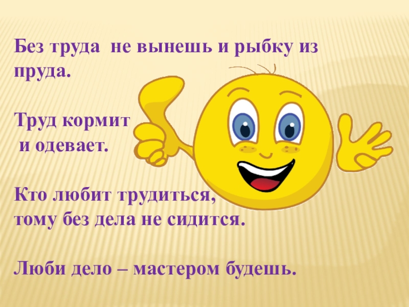 Без труда не вынешь и рыбку из пруда.Труд кормит и одевает.Кто любит трудиться,тому без дела не сидится.Люби
