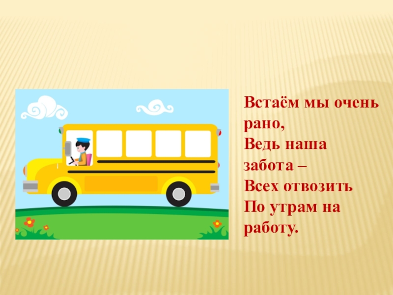 Встаём мы очень рано,Ведь наша забота –Всех отвозить По утрам на работу.
