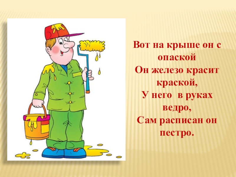 Вот на крыше он с опаскойОн железо красит краской,У него в руках ведро,Сам расписан он пестро.