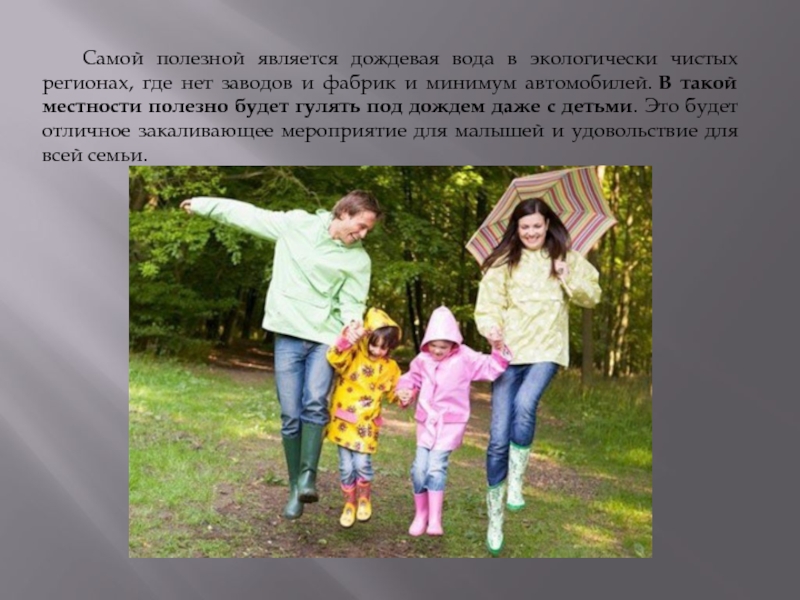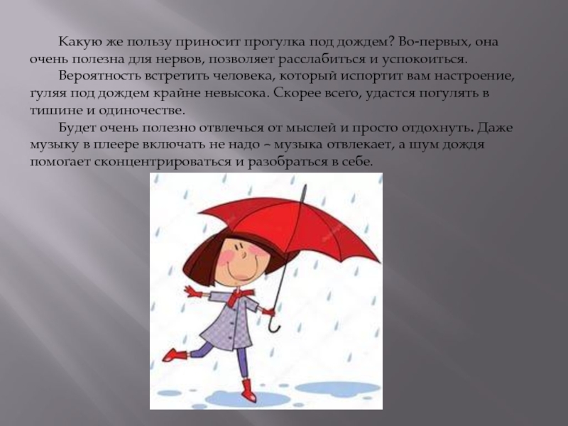 Слайд 13Какую же пользу приносит прогулка под дождем? Во-первых, она очень полезна для