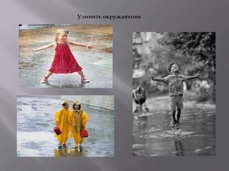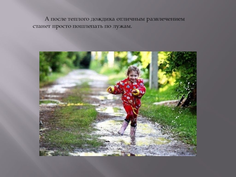 Слайд 17А после теплого дождика отличным развлечением станет просто пошлепать по лужам.