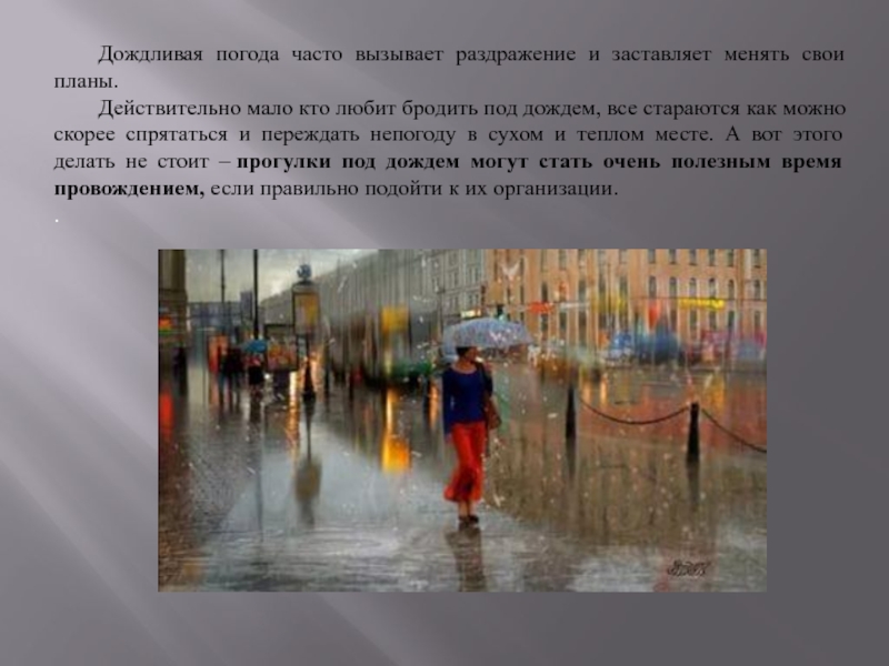Слайд 2Дождливая погода часто вызывает раздражение и заставляет менять свои планы.