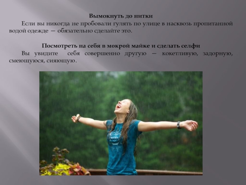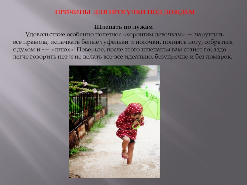 Слайд 4 ПРИЧИНЫ ДЛЯ ПРОГУЛКИ ПОД ДОЖДЕМ