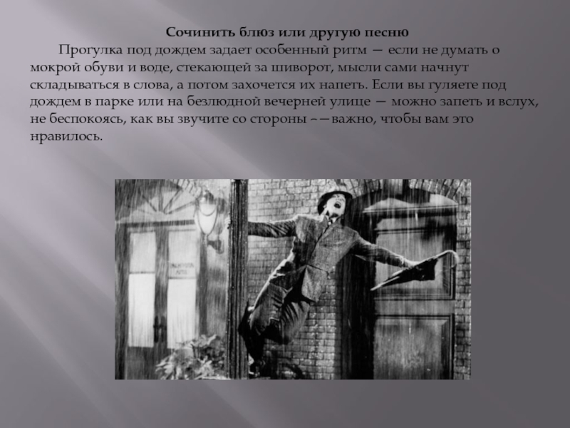 если не думать о мокрой обуви и воде, стекающей за шиворот, мысли сами начнут складываться в слова, а потом захочется их напеть. Если вы гуляете под дождем в парке или на безлюдной вечерней улице — можно запеть и вслух, не беспокоясь, как вы звучите со стороны –—важно, чтобы вам это нравилось.