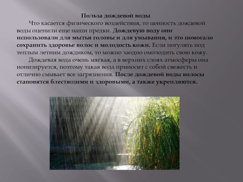 еще наши предки. Дождевую воду они использовали для мытья головы и для умывания, и это помогало сохранить здоровье волос и молодость кожи. Если погулять под теплым летним дождиком, то можно заодно омолодить свою кожу.