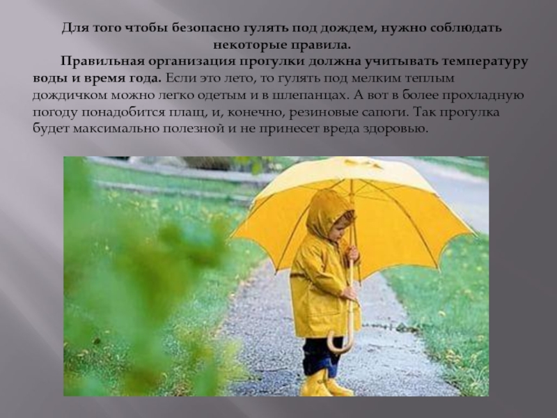 Слайд 12Для того чтобы безопасно гулять под дождем, нужно соблюдать некоторые правила.