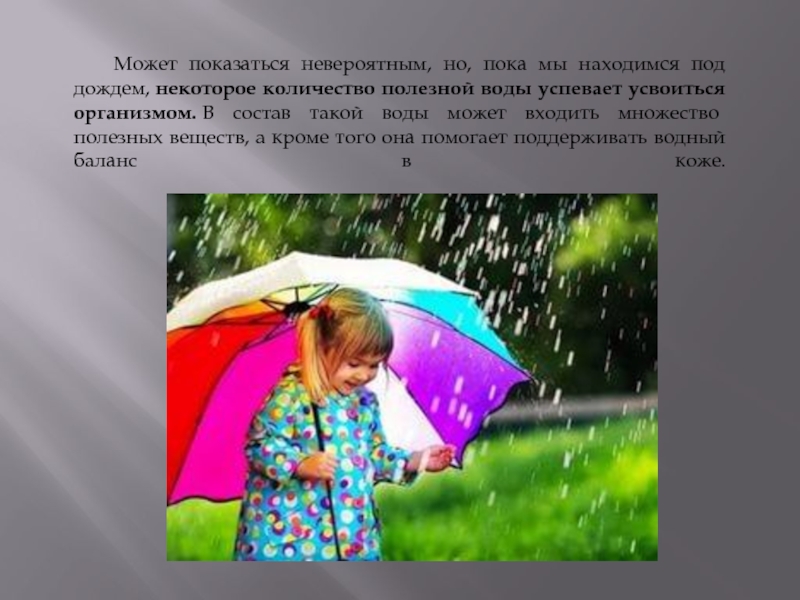 Слайд 15Может показаться невероятным, но, пока мы находимся под дождем, некоторое количество полезной