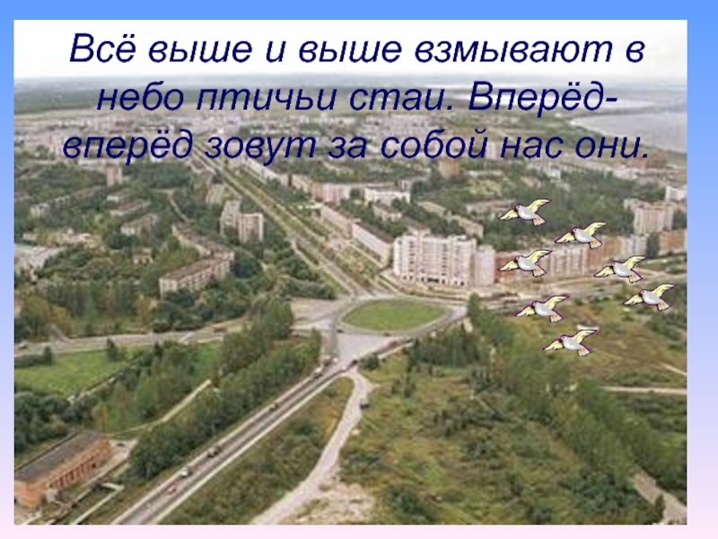 Слайд 3Всё выше и выше взмывают в небо птичьи стаи. Вперёд- вперёд