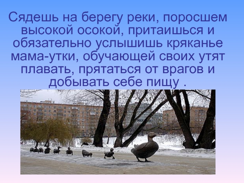 Сядешь на берегу реки, поросшем высокой осокой, притаишься и обязательно услышишь кряканье мама-утки, обучающей своих утят плавать,