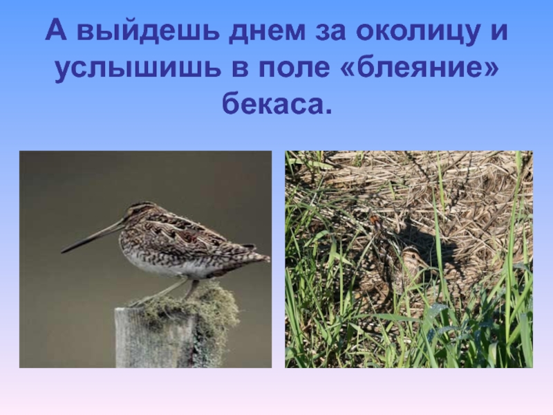 Слайд 12А выйдешь днем за околицу и услышишь в поле «блеяние» бекаса.