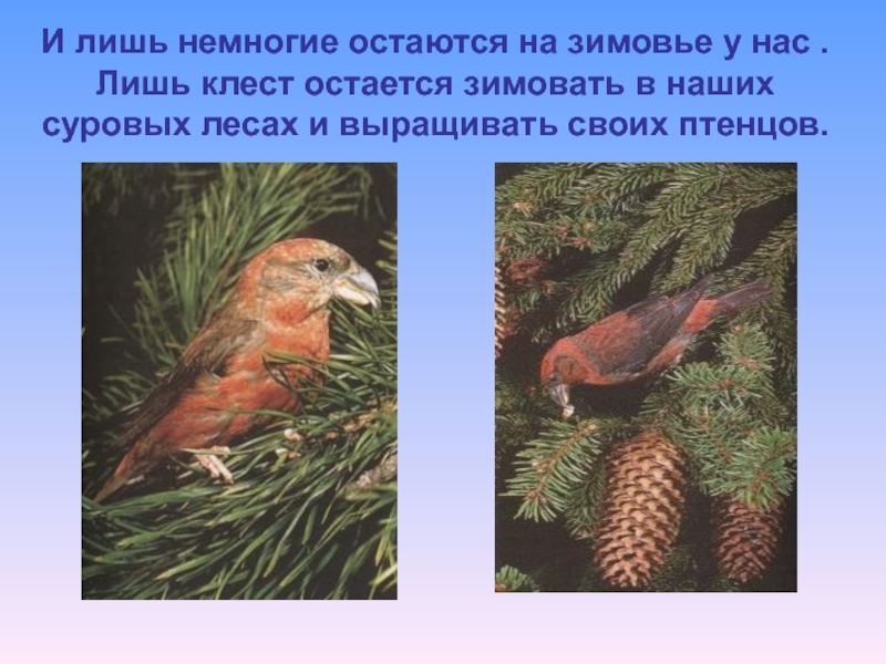 Слайд 18И лишь немногие остаются на зимовье у нас .Лишь клест остается