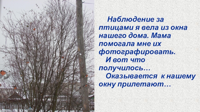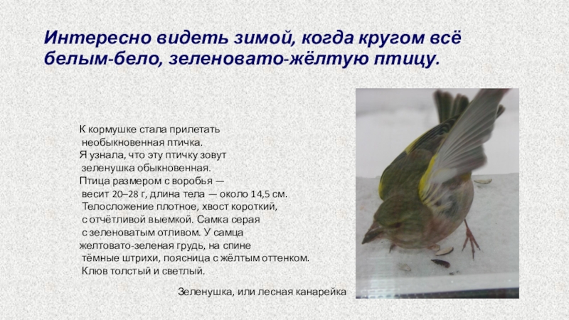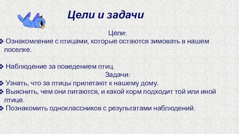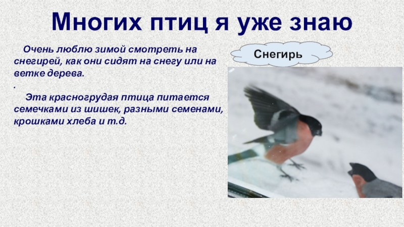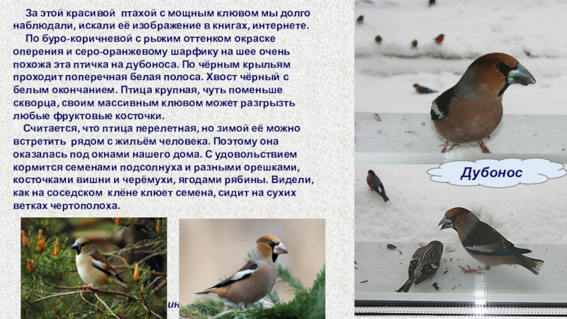 1. В нашем посёлке рядом с человеком зимуют воробьи, голуби, синицы, сороки, чечётки, сойки, зеленушки и редкие гости - дубоносы ; прилетают из леса покормиться снегири.