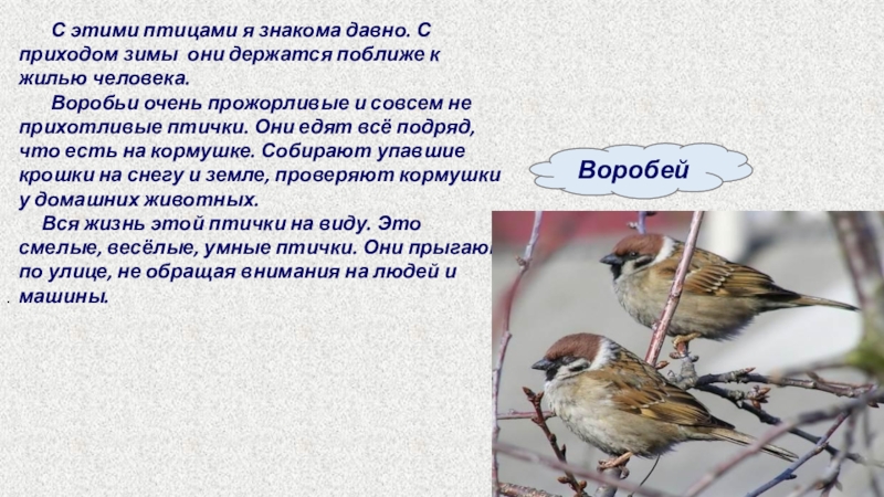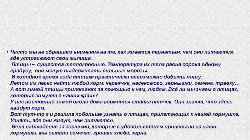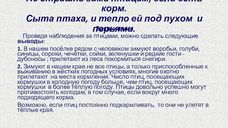 2. Зимуют в нашем крае не все птицы, а только приспособленные к выживанию в жёстких погодных условиях, многие охотно прилетают на места кормления. Число птиц, посещающих кормушки в холодную погоду больше, чем птиц, посещающих кормушки в более тёплую погоду. Птицы довольно успешно могут противостоять холодам, в том случае, если вокруг много подходящего корма.