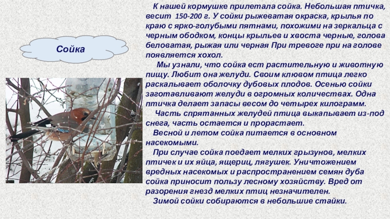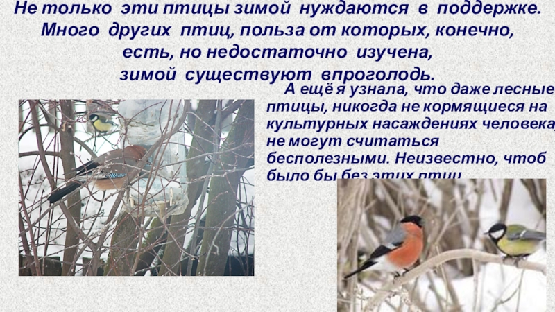 А ещё я узнала, что даже лесные птицы, никогда не кормящиеся на культурных насаждениях человека, не могут считаться бесполезными. Неизвестно, чтоб было бы без этих птиц.