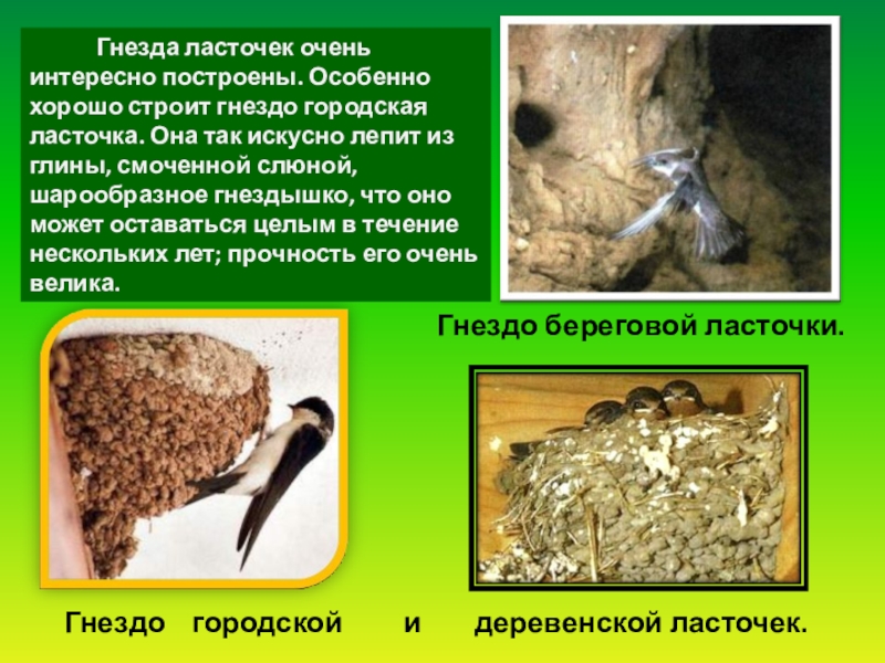 Гнезда ласточек очень интересно построены. Особенно хорошо строит гнездо городская ласточка. Она так искусно лепит из глины, смоченной слюной, шарообразное гнездышко, что оно может оставаться целым в течение нескольких лет; прочность его очень велика.