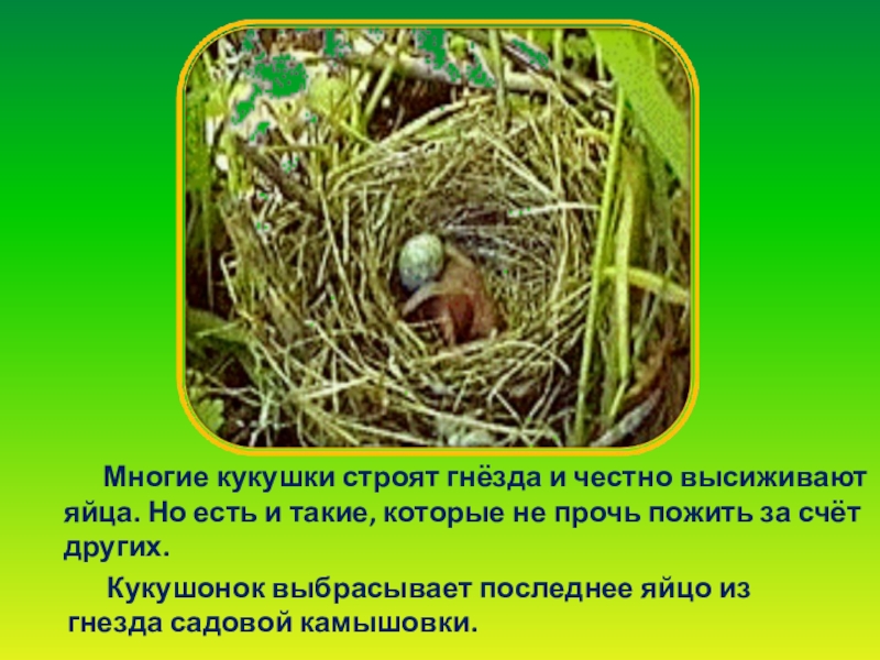 Кукушонок выбрасывает последнее яйцо из гнезда садовой камышовки.