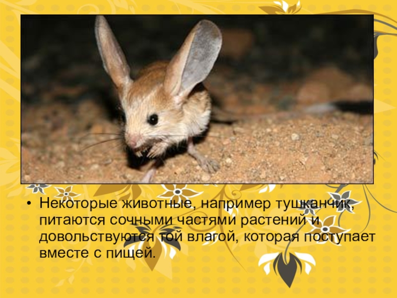 Слайд 16Некоторые животные, например тушканчик, питаются сочными частями растений и довольствуются той