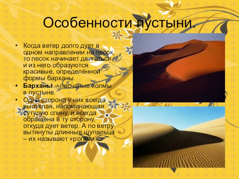 Особенности пустыни.Когда ветер долго дует в одном направлении на песок, то песок начинает двигаться и из него