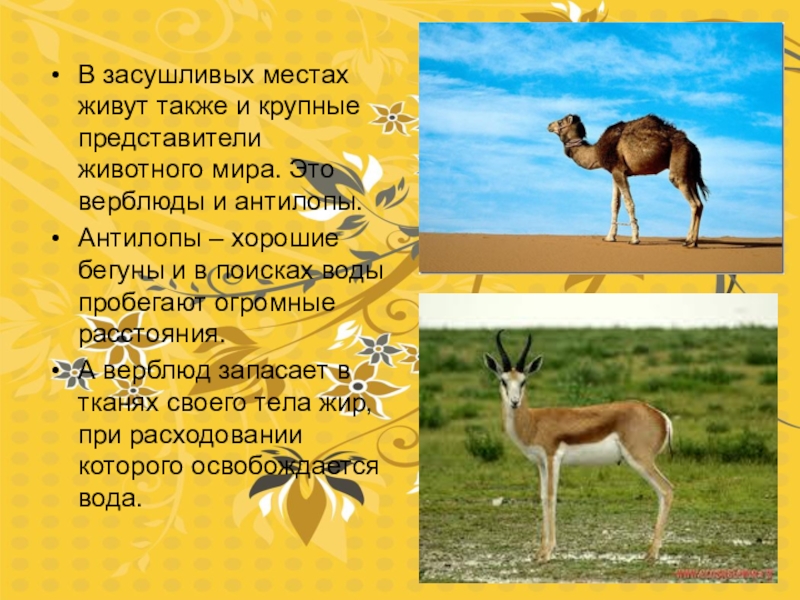 В засушливых местах живут также и крупные представители животного мира. Это верблюды и антилопы. Антилопы – хорошие