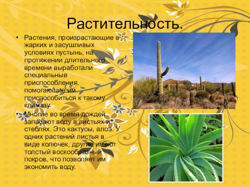 Растительность.Растения, произрастающие в жарких и засушливых условиях пустынь, на протяжении длительного времени выработали специальные приспособления, помогающие им