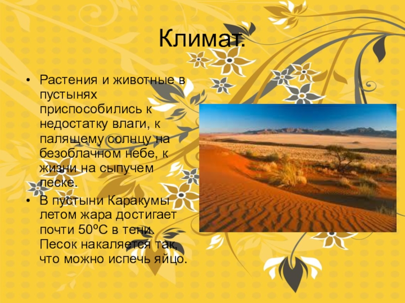 Климат.Растения и животные в пустынях приспособились к недостатку влаги, к палящему солнцу на безоблачном небе, к жизни