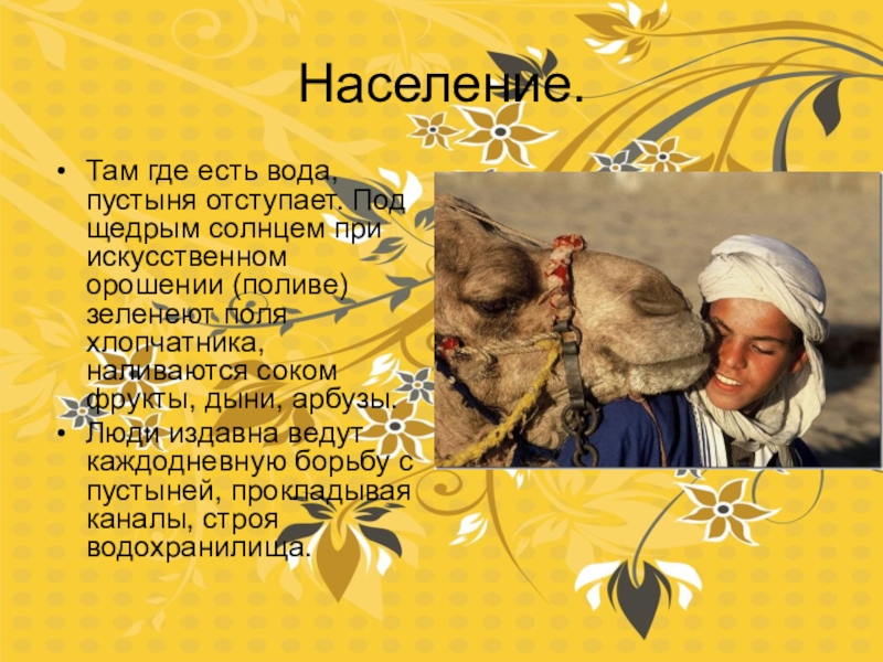 Население.Там где есть вода, пустыня отступает. Под щедрым солнцем при искусственном орошении (поливе) зеленеют поля хлопчатника, наливаются