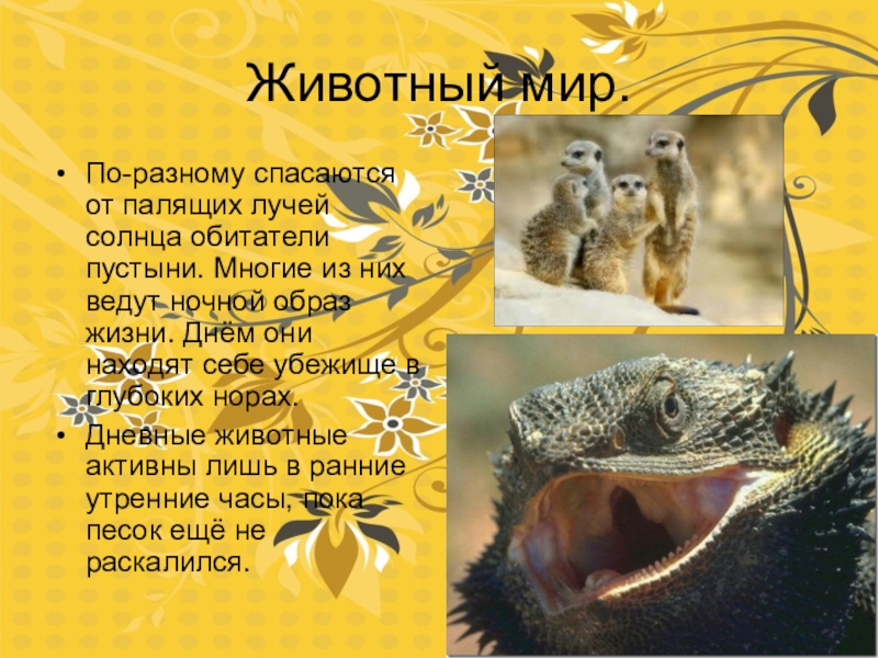 Животный мир.По-разному спасаются от палящих лучей солнца обитатели пустыни. Многие из них ведут ночной образ жизни. Днём