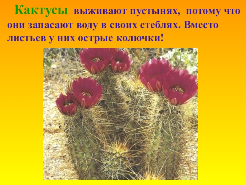 Кактусы выживают пустынях, потому что они запасают воду в своих стеблях. Вместо листьев у них острые колючки!