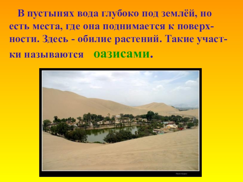 где она поднимается к поверх-ности. Здесь - обилие растений. Такие участ-ки называются оазисами.