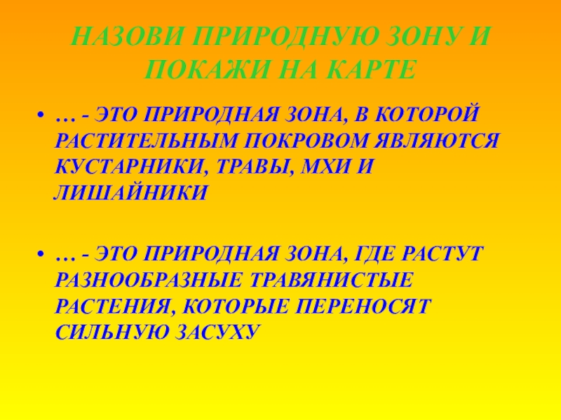 Слайд 4НАЗОВИ ПРИРОДНУЮ ЗОНУ И ПОКАЖИ НА КАРТЕ
