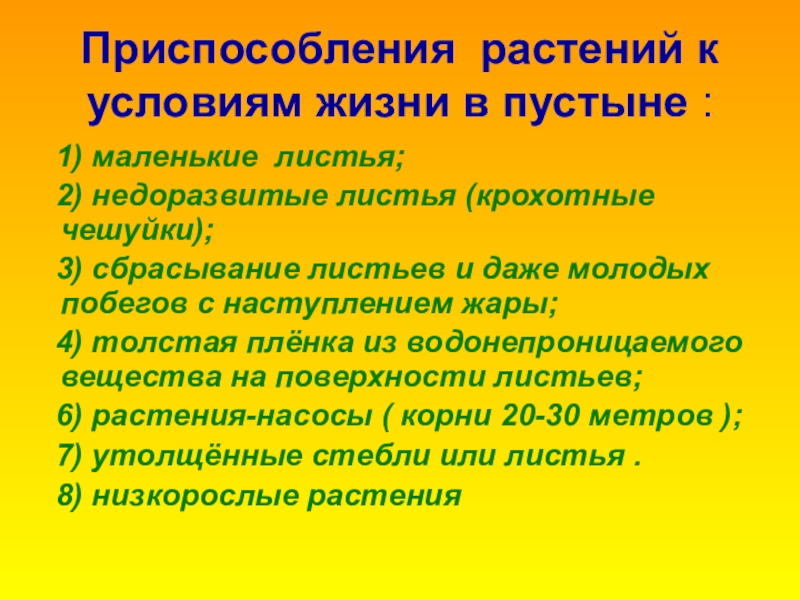 Слайд 29Приспособления растений к условиям жизни в пустыне :