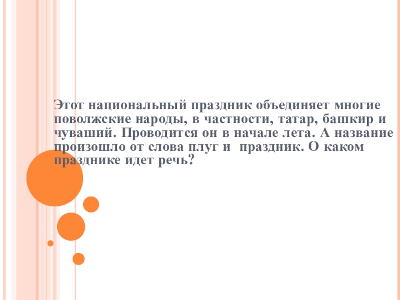 Слайд 6Этот национальный праздник объединяет многие поволжские народы, в частности, татар, башкир