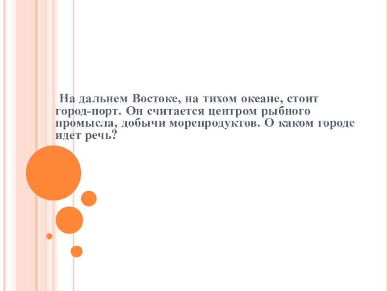 На дальнем Востоке, на тихом океане, стоит город-порт. Он считается центром рыбного промысла, добычи морепродуктов. О